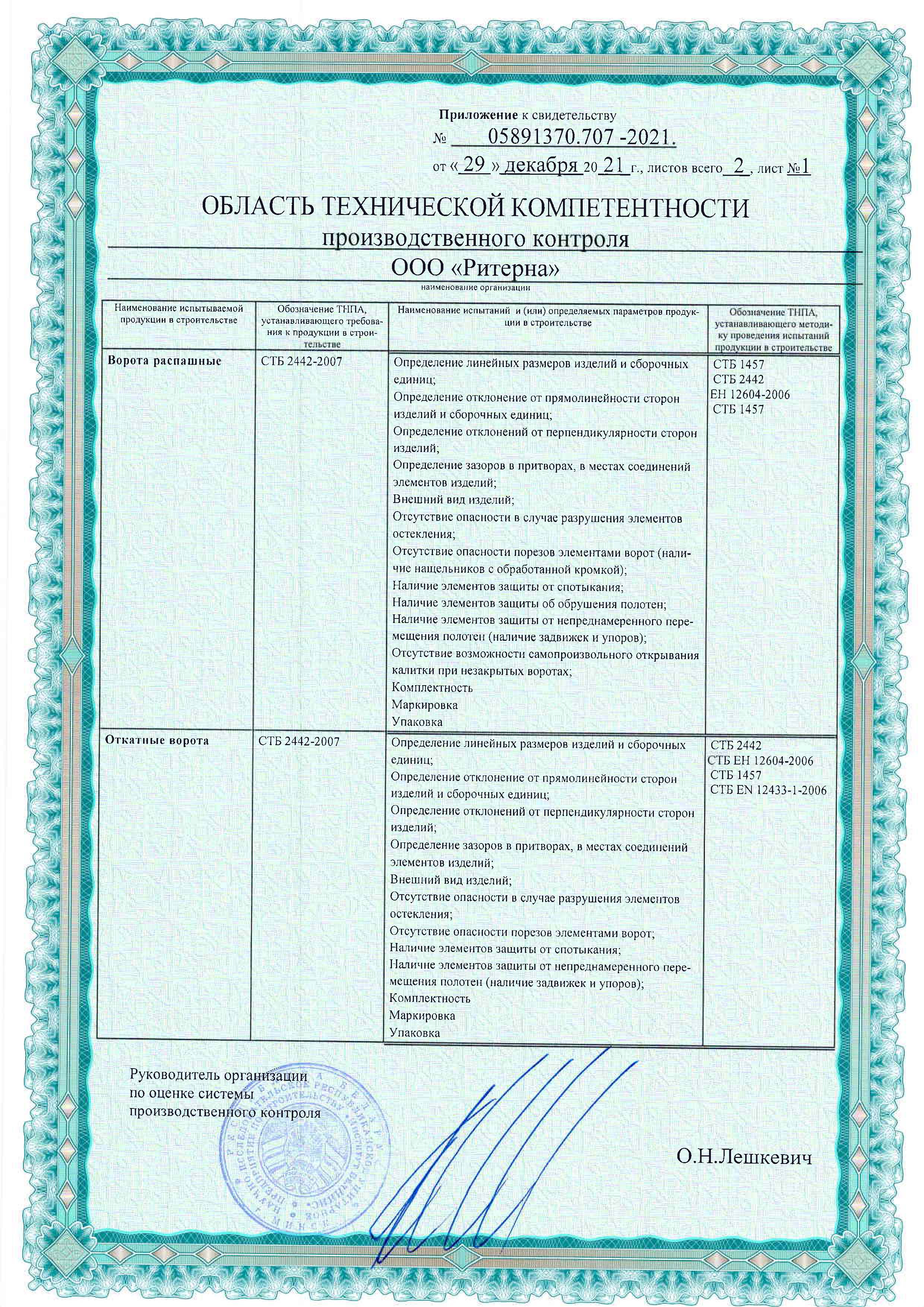 Компания ООО «Ритерна» уделяет особое внимание качеству и безопасности выпускаемой продукции. Соответствие продукции установленным требованиям подтверждено сертификатами соответствия, декларациями и свидетельствами, выданными аккредитованными органами по сертификации.