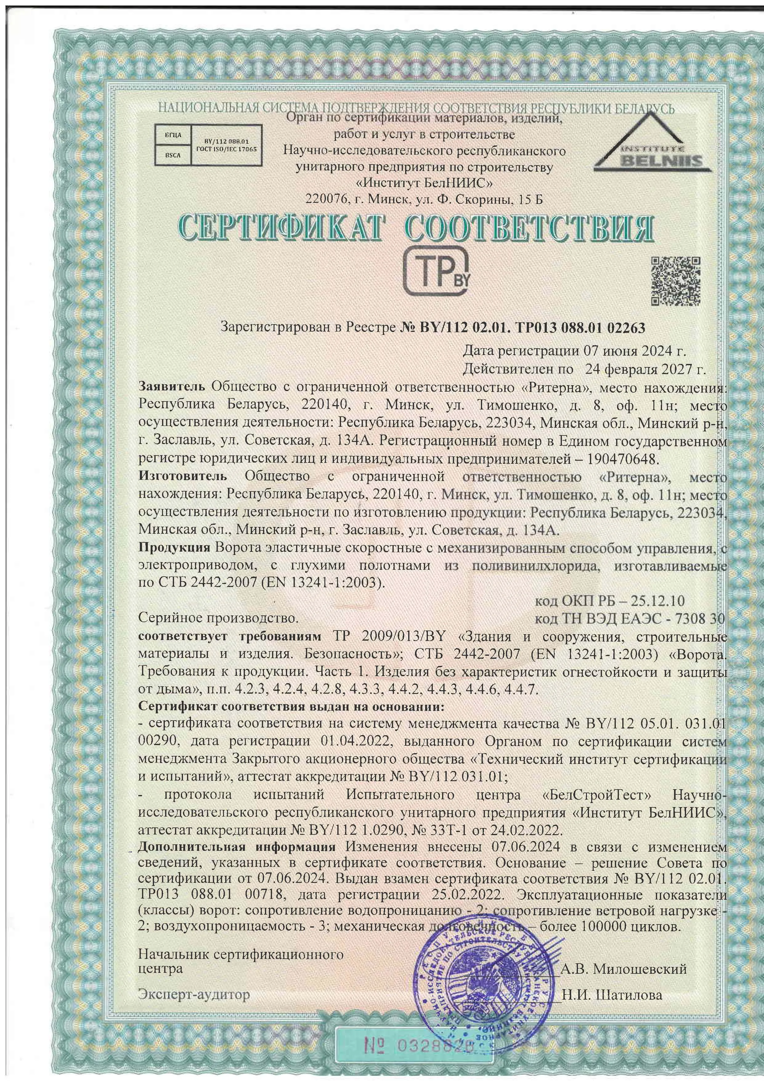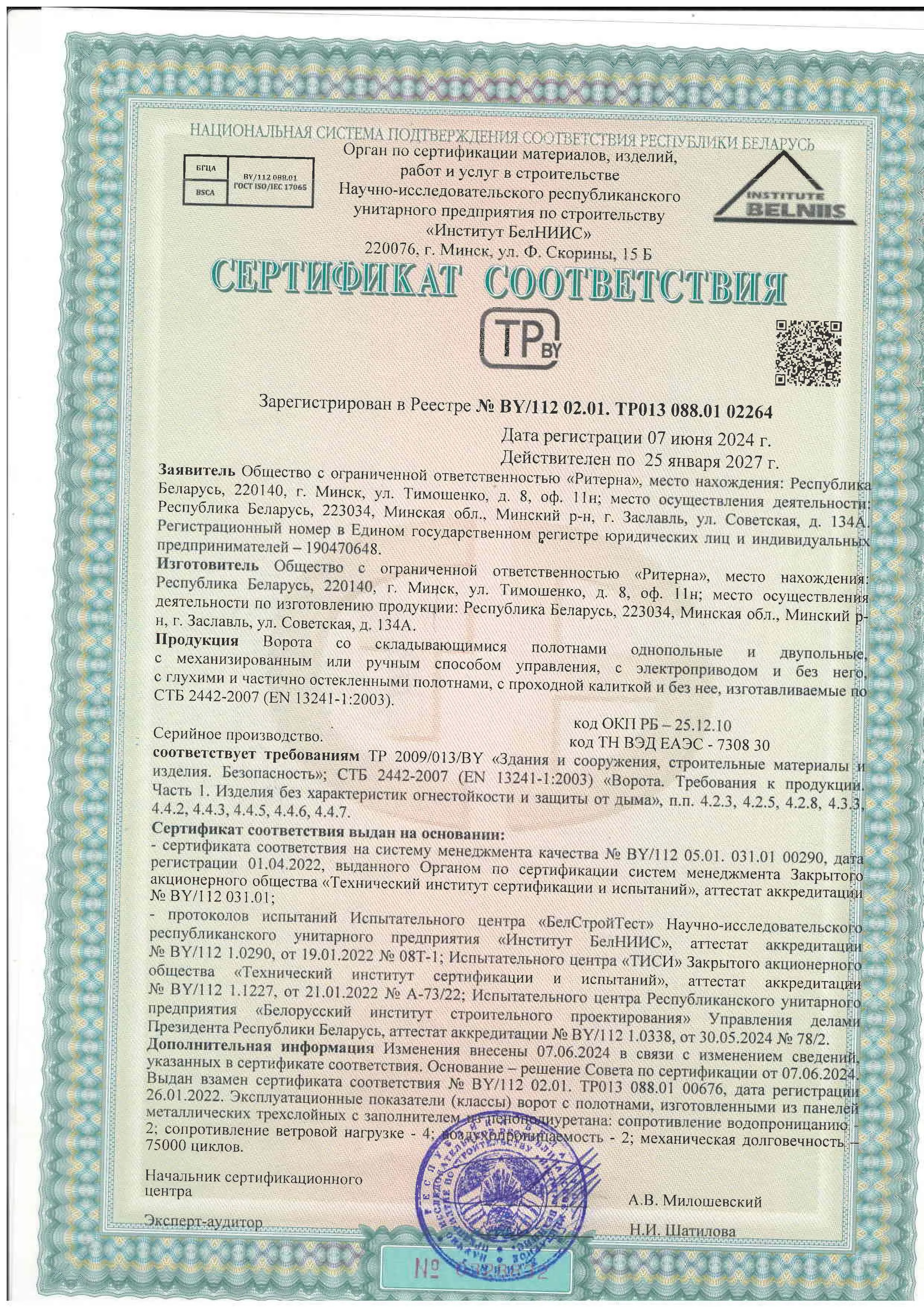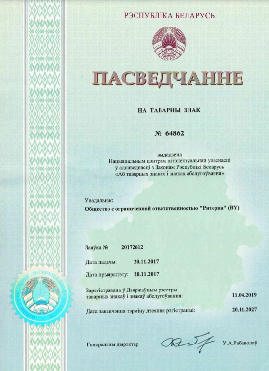 Компания ООО «Ритерна» уделяет особое внимание качеству и безопасности выпускаемой продукции. Соответствие продукции установленным требованиям подтверждено сертификатами соответствия, декларациями и свидетельствами, выданными аккредитованными органами по сертификации.