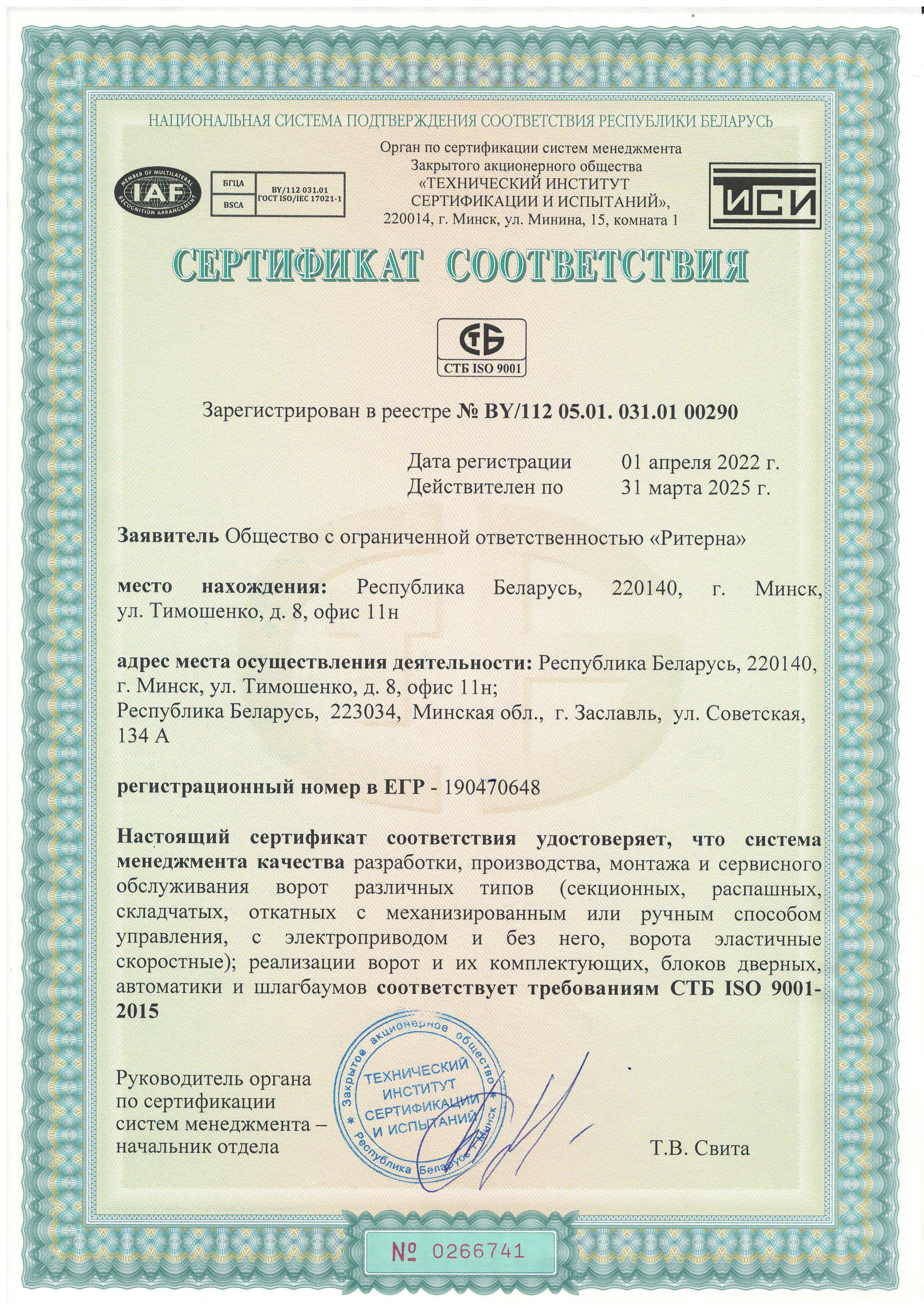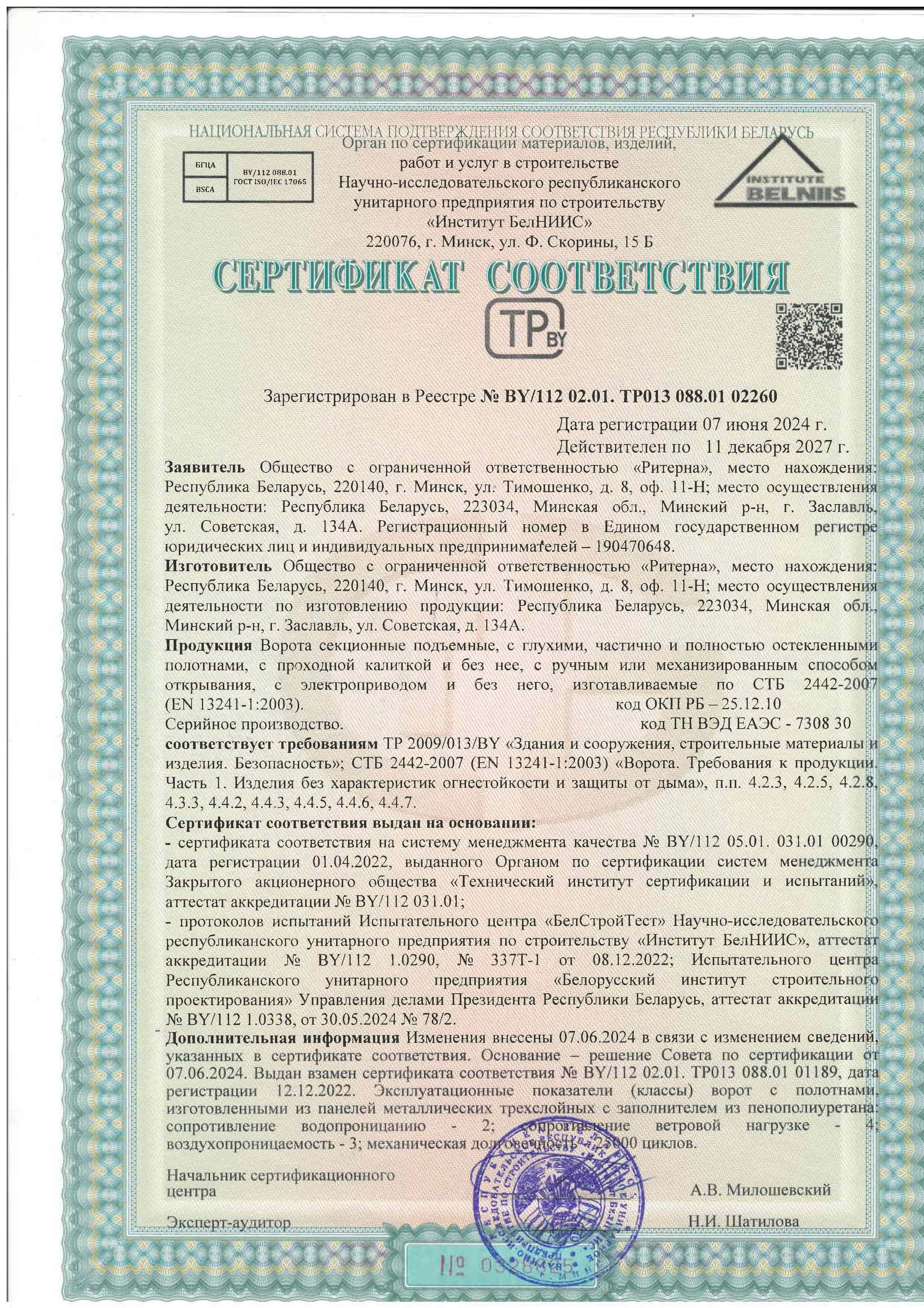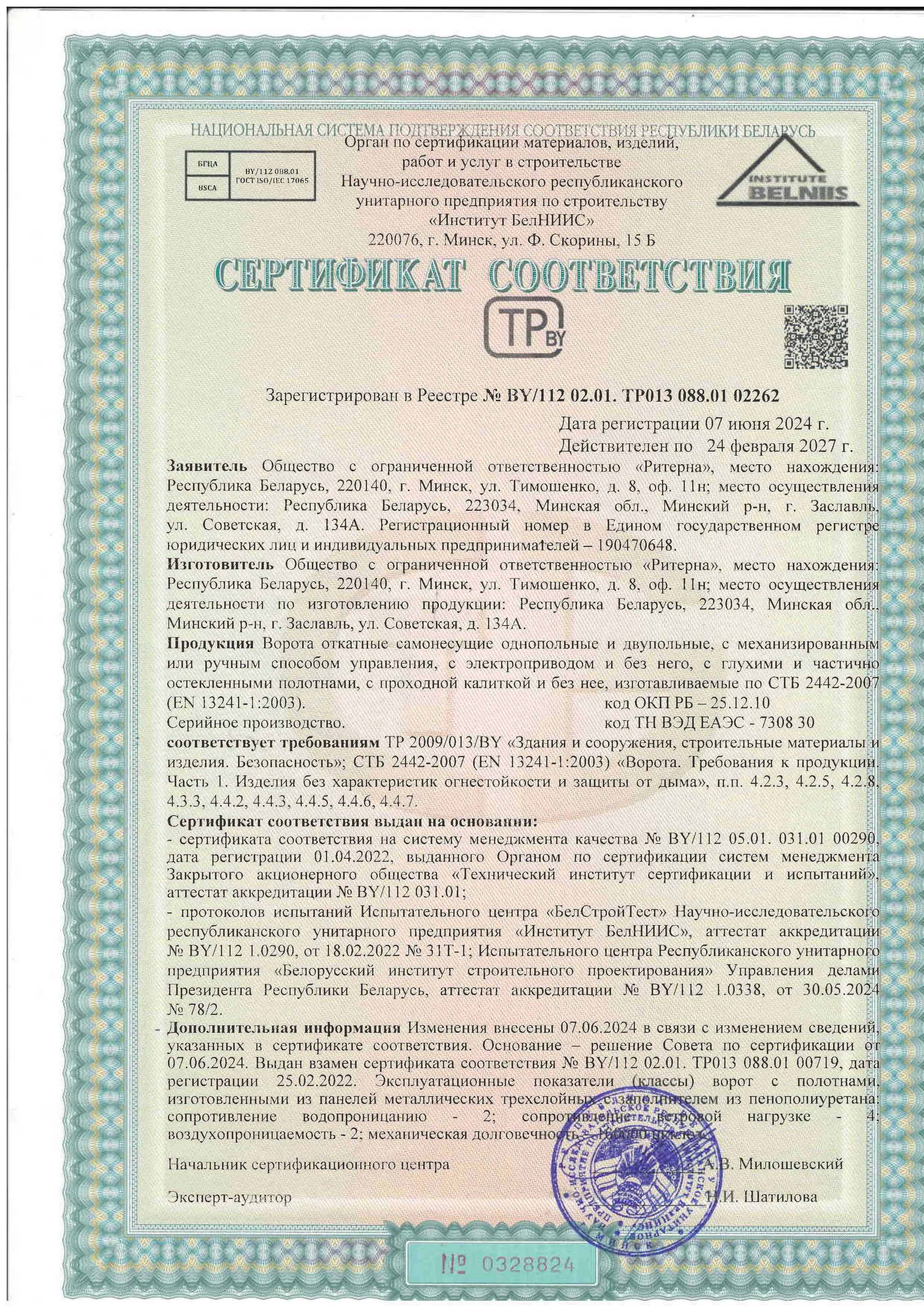 Компания ООО «Ритерна» уделяет особое внимание качеству и безопасности выпускаемой продукции. Соответствие продукции установленным требованиям подтверждено сертификатами соответствия, декларациями и свидетельствами, выданными аккредитованными органами по сертификации.