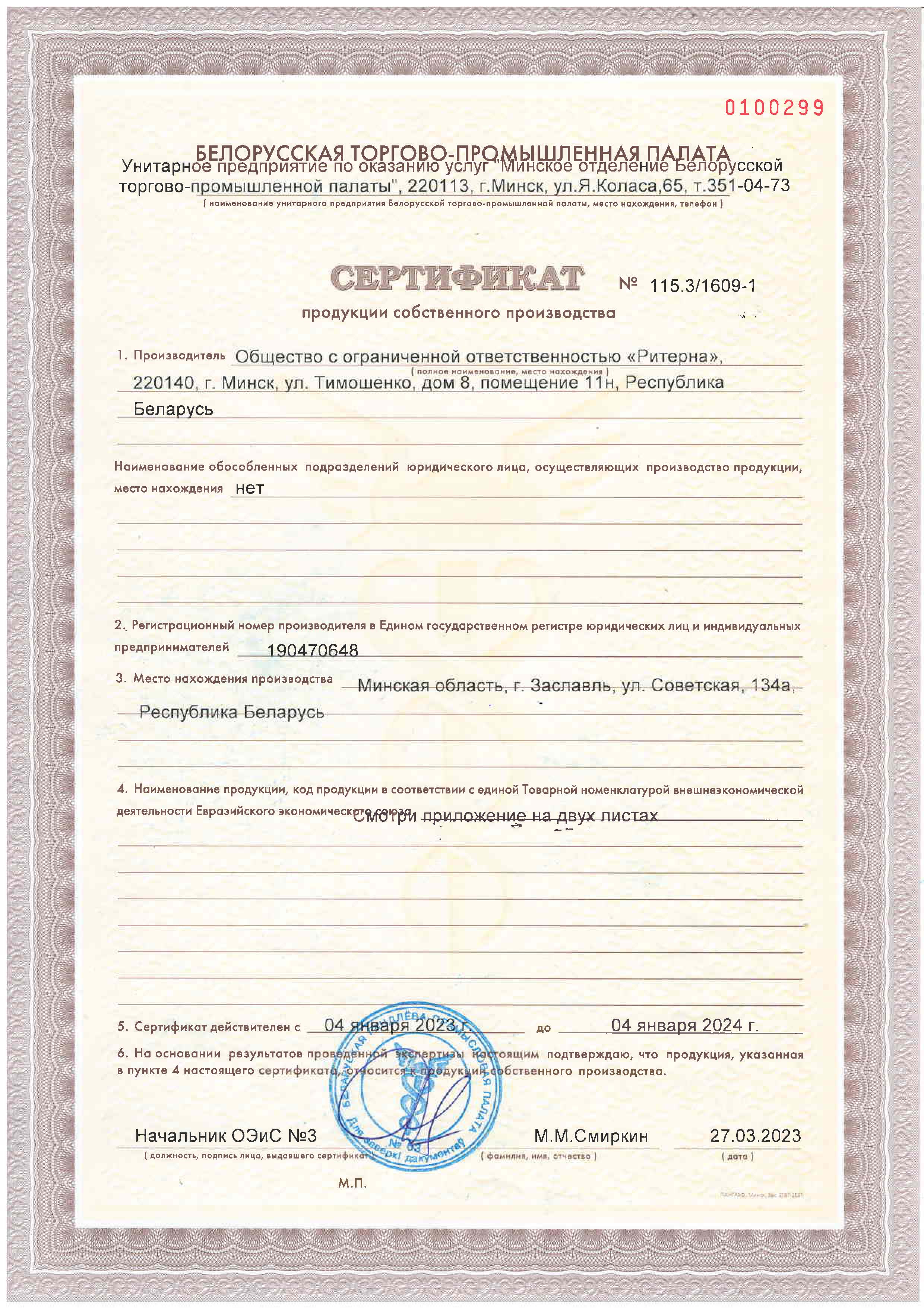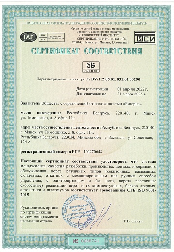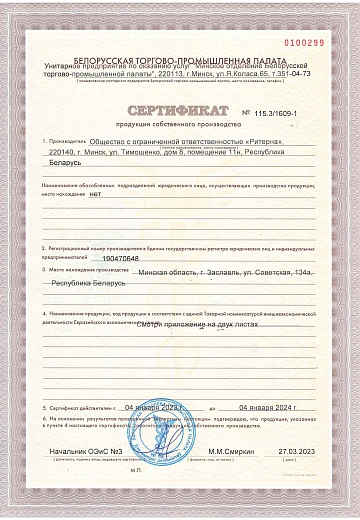 ООО «Ритерна» регулярно проходит процедуры сертификации, что гарантирует стабильное качество, надежность и соответствие продукции заявленным характеристикам.